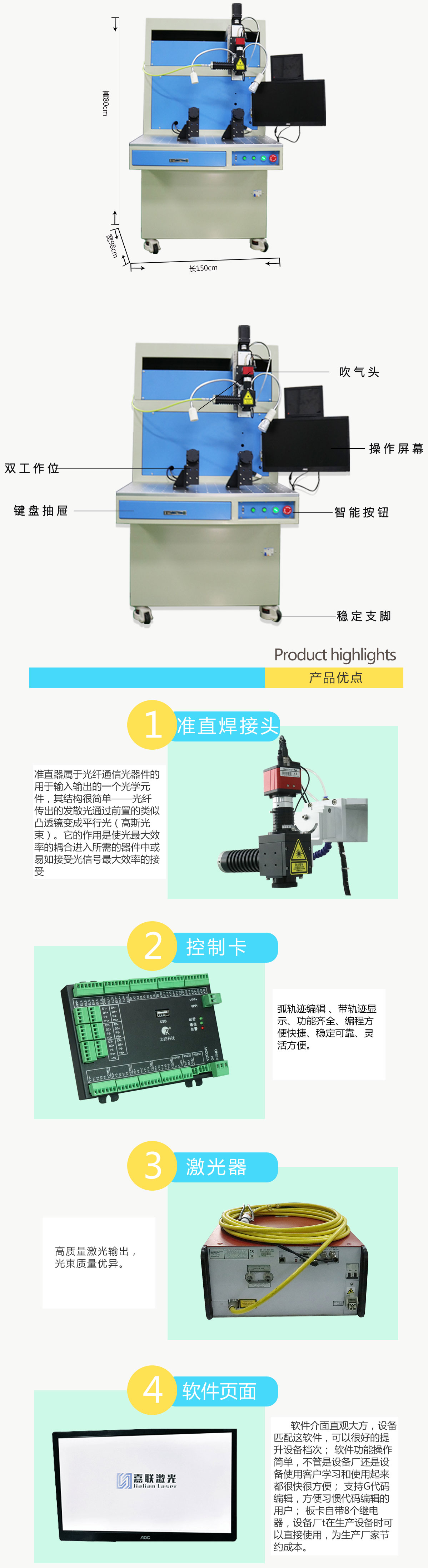 雙工位激光接機(jī),采用200-1000瓦光纖激光器,電光轉(zhuǎn)換效率高,激光器壽命長(zhǎng)。電源提供的能量25%-30%轉(zhuǎn)化為激光能,是當(dāng)前轉(zhuǎn)化能量最高的激光器。采用敞開式雙工位激光焊接工作平臺(tái),智能化操作:機(jī)、水、電、氣集成防靜電式;配置觀察窗及門,利于維護(hù)和安裝,門開關(guān)保護(hù)裝置和報(bào)警燈顯示,附加簡(jiǎn)易抽風(fēng)裝置。工作效率高,是常規(guī)激光焊接機(jī)的2.3倍。